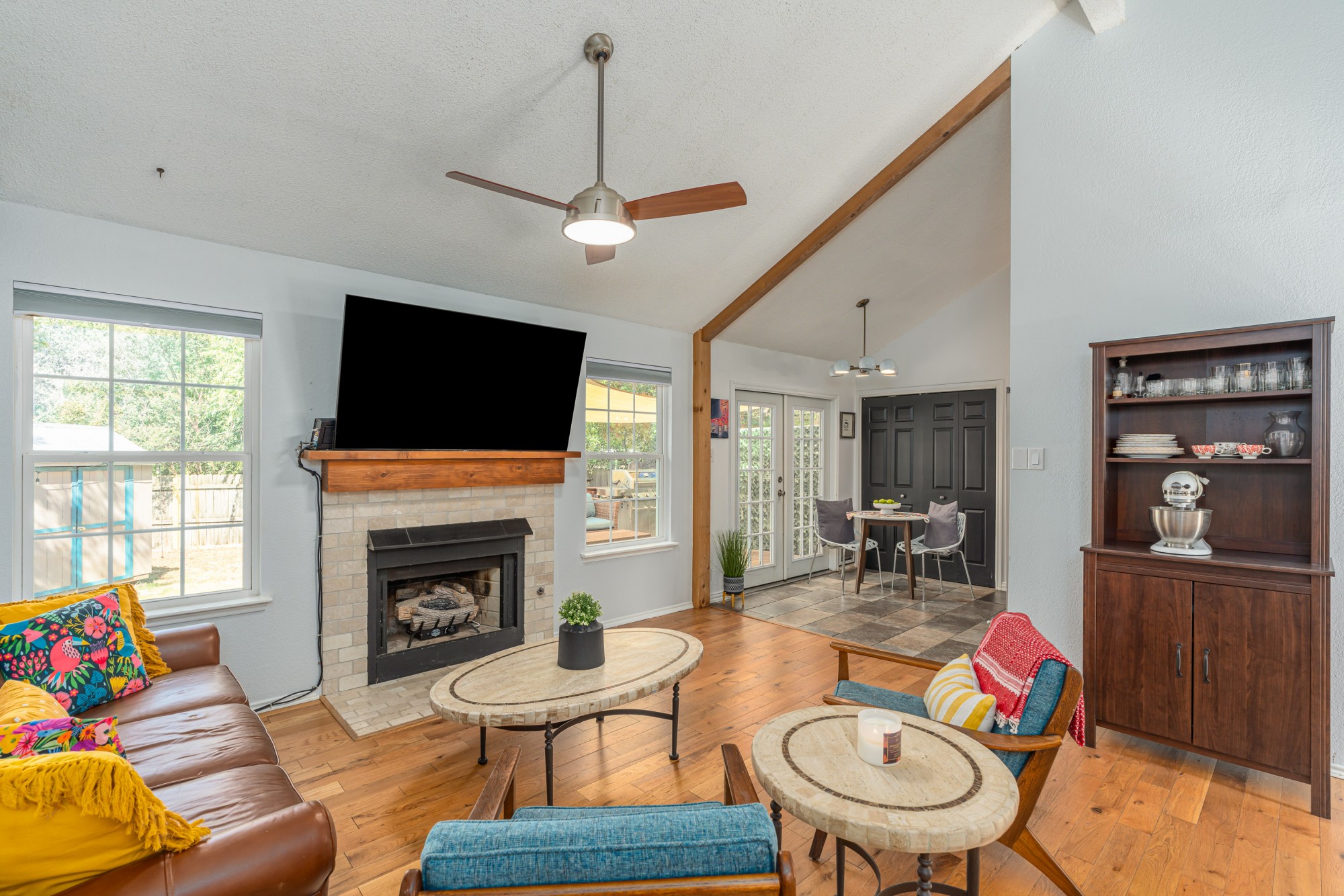 As you step inside, you'll be greeted by a bright and airy living space characterized by vaulted ceilings and exposed beams, lending an inviting atmosphere to the home. The cozy wood-burning fireplace in the living room is perfect for those cooler Texas evenings, providing warmth and a focal point for family gatherings.
