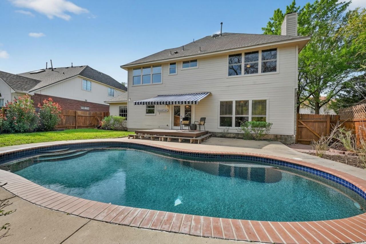 Backyard summers start here.Located in sought-after OakCreek community, an established neighborhood with tree-lined streets and manicured lawns, this 4-bedroom, 2.5-bath home offers 2,546 sqft of flexible living space with a classic traditional style, a refreshing private in-ground pool, wood deck with retractable awning (with wind sensors), and a floor plan that offers flexibility and comfort.Inside, cathedral ceilings elevate the formal living, while the dining room, kitchen, breakfast area provide seamless room for gatherings. THe kitchen features white cabinetry and stainless steel appliances including a gas cooktop, built-in self-cleaning oven, microwave, dishwasher, center island and quaint built-in desk with open shelves. The breakfast area is open to a welcoming den which includes a gas-log fireplace and overlooks the peaceful backyard and pool; creating an easy indoor-outdoor flow ideal for entertaining.Fresh neutral interior paint and hard-surface flooring throughout the main level (wood-look laminate and tile) offer durability and style, perfect for everyday living and wet pool feet. All four bedrooms are upstairs, keeping a quiet space separate from common areas. The oversized primary suite includes a large walk-in closet, ensuite bath with dual vanities, soaking tub, separate shower, and private water closet. The secondary bedrooms and bath are generously sized.Additional features include indoor laundry with sink and space for an extra fridge/freezer, and a secondary laundry hookup in the garage, ideal for pool towels. OakCreek amenities include a community pool, with kiddie pool, playscape, picnic tables, BBQ grill, and clubhouse. The location is ideal to several major tech employers, medical facilities, vibrant and hip downtown Round Rock, and cool and trendy Domain in NW Austin. The 2 cherries on top? A super low 1.799 tax rate or and this property is priced $50k below the 2025 tax appraisal. A win/win!