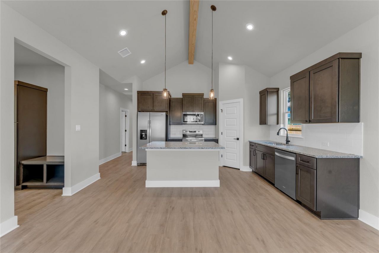 Welcome to this new construction barndominium-style home located in the heart of Bertram. This 3 bedroom, 2 bathroom home offers 1,336 sq ft of living space with a functional layout and modern finishes throughout. The home features an open floor plan with high ceilings and recessed lighting throughout, creating a bright and spacious living area. The interior includes vinyl plank flooring throughout the main living spaces with carpet in the bedrooms. A mudroom space and conveniently located laundry room add everyday practicality to the layout.The kitchen includes granite countertops throughout, modern stainless steel appliances, a center granite kitchen island, subway tile backsplash, and opens directly to the main living area for easy flow between spaces.The primary suite offers a spacious layout and connects to the primary bathroom featuring dual granite vanities, a separate walk-in tiled shower, and a walk-in closet.Additional features include an attached 1-car garage and covered front and back porches overlooking the private backyard, providing space to enjoy the outdoors.Located in a central Bertram location with easy access to the main highway, the builder will provide the final survey and a home warranty.