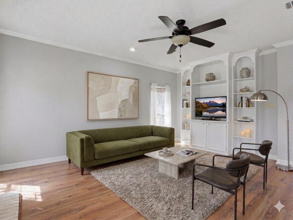 2501 Partridge Court sits on a quiet cul-de-sac in the Oakcreek community. This home features a functional layout with four bedrooms, three and a half bathrooms, and multiple living areas. The interior includes a dedicated media room with a wet bar, a private home office, and custom cabinetry throughout the living room and garage. Situated on an oversized corner lot, the property provides a private retreat with a backyard that backs directly onto a lush greenbelt and a scenic creek. The location offers exceptional convenience for commuting and daily life. Highly-rated Fern Bluff Elementary is just 0.2 miles away, while Chisholm Trail Middle and Round Rock High School are both within 1.2 miles. For errands and recreation, an H-E-B grocery store and local dining options are less than 2 miles away, and the home is steps from the Fern Bluff MUD park system and the Brushy Creek Regional Trail. Additionally, rapid access to RM 620, I-35, and MoPac makes for an easy drive to major tech employers and The Domain.