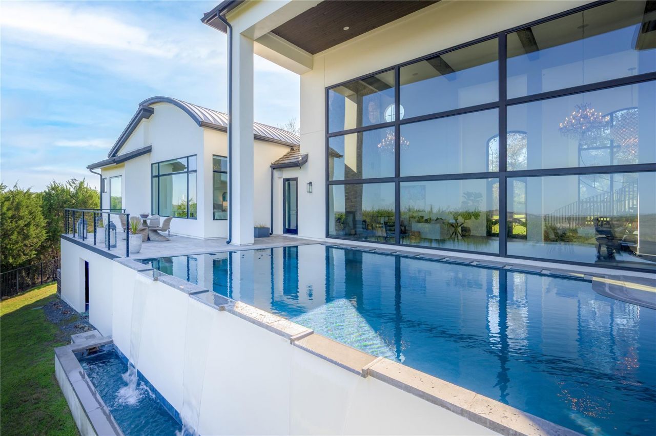 Views! Views! Views! Experience refined Hill Country living in this modern estate located within private gated community on 1.7 acres at end of quiet cul-de-sac, showcasing sweeping panoramic views. This residence is designed with balance of luxury, comfort, and functionality, offering thoughtfully connected living spaces ideal for both everyday living and elevated entertaining. Home features 6 bedrooms, 5 baths, 2 half baths, along with multiple flexible-use areas that enhance livability. Open-concept main living areas are filled with natural light and create seamless flow between kitchen, dining, and living spaces. Private office provides ideal work-from-home setting, while additional dedicated spaces include media room w/ cocktail bar, and versatile bonus room designed for recreation. The primary suite and secondary bedrooms are generously proportioned, offering privacy and comfort throughout. The detached casita supports multi-generational living or guest accommodations with ease. Ownership includes access to Lake Travis, providing an exceptional opportunity to enjoy one of the regions premier recreational lakes for boating, swimming, and leisure. Outdoor living is complemented by homes elevated setting, capturing expansive Hill Country vistas and providing serene backdrop for relaxation or entertaining. Outdoor living offers an infinity-edge swimming pool and spa as well as a wood burning fireplace that take full advantage of the surrounding Hill Country views. A 3-car garage offers ample parking and storage, completing this well-appointed and private property. Blending modern design, flexible living spaces, premier amenities, lake access, and a sought-after school district, this residence delivers a rare opportunity to enjoy privacy, space, and breathtaking views in a highly desirable Hill Country setting. Lots of storage! Property also located within highly acclaimed Lake Travis Independent School District, known for exemplary academic and sports programs.